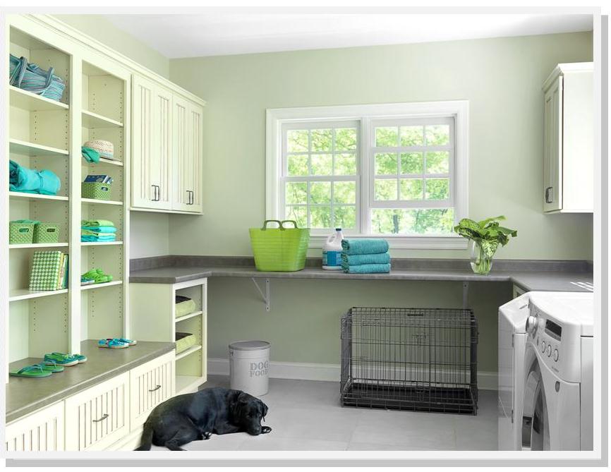 Details haven’t gone un-noticed in the neighboring new family center and laundry room. With plenty of storage space in lockers, over-sized drawers and cabinets, this room becomes an organizational hub of the home for everyone, four-legged family members included. The prairie door style and Vanilla painted finish help carry the feel of the nearby kitchen throughout the house.