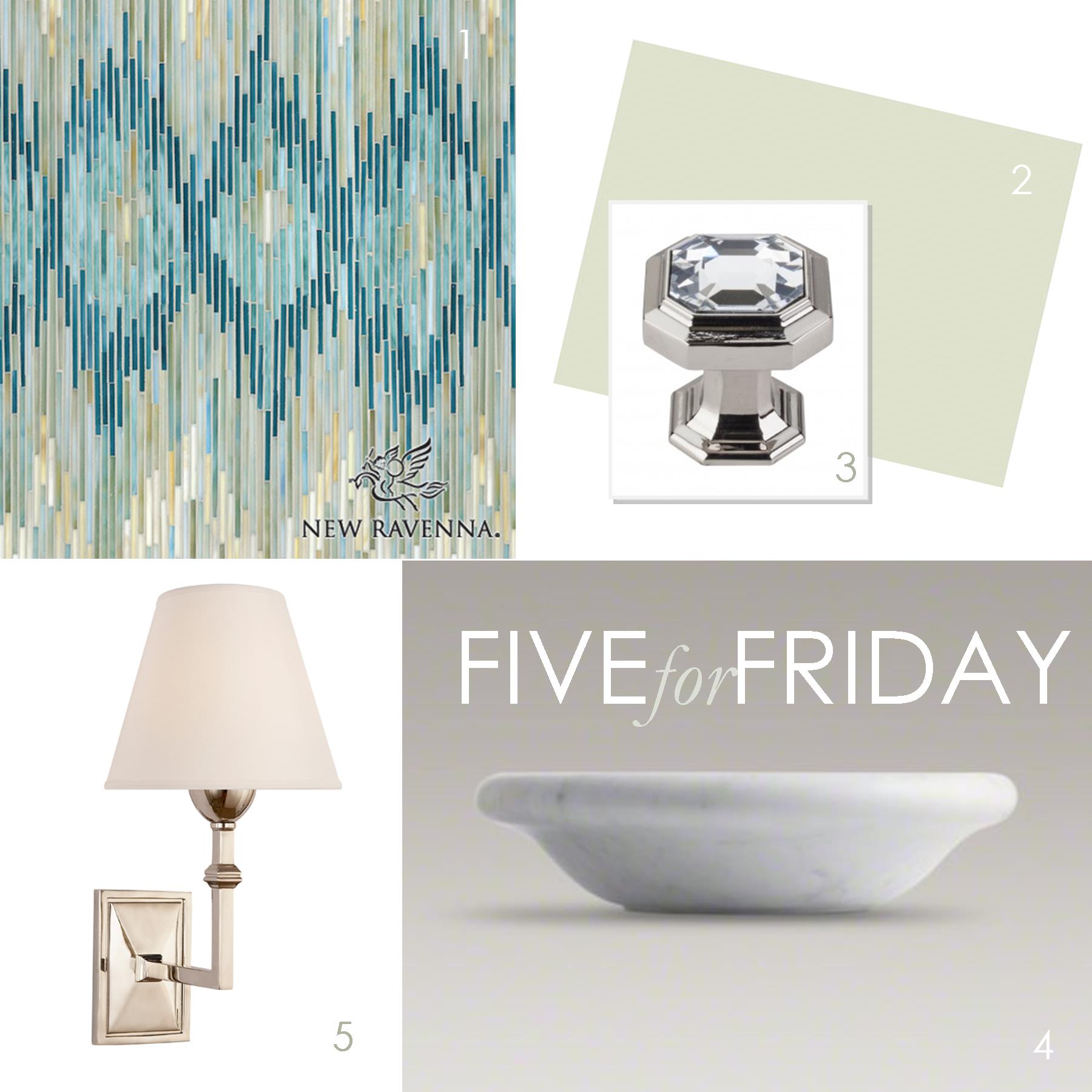 1. Loom from the Ikat Collection, New Ravenna Mosaics. 2. Sage Paint Finish, Crystal Cabinetry. 3. Chareau Crystal Knob, Top Knobs. 4. Jane Wall Sconce by Alexa Hampton, Circa Lighting. 5. Botticelli Sink, Kohler.