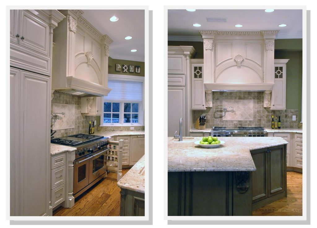 To complement the functionality of their new space, Mike took the homeowner’s personal style into account when choosing thoughtful design details such as the custom mullions at the top of the wall cabinets and the unique range hood. The kitchen features Crystal’s Huntington door style finished in Antique White with Van Dyke Brown highlights on maple.