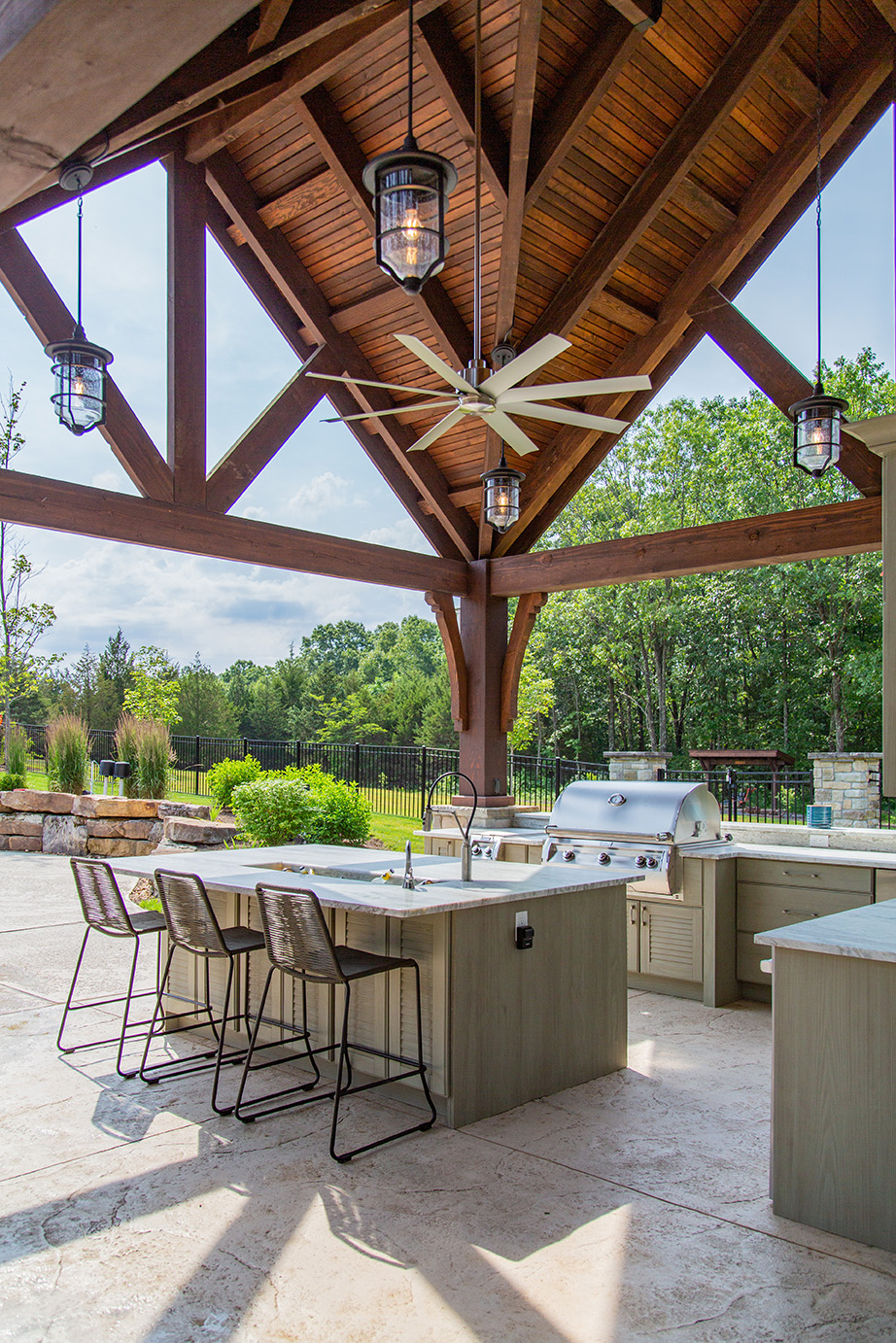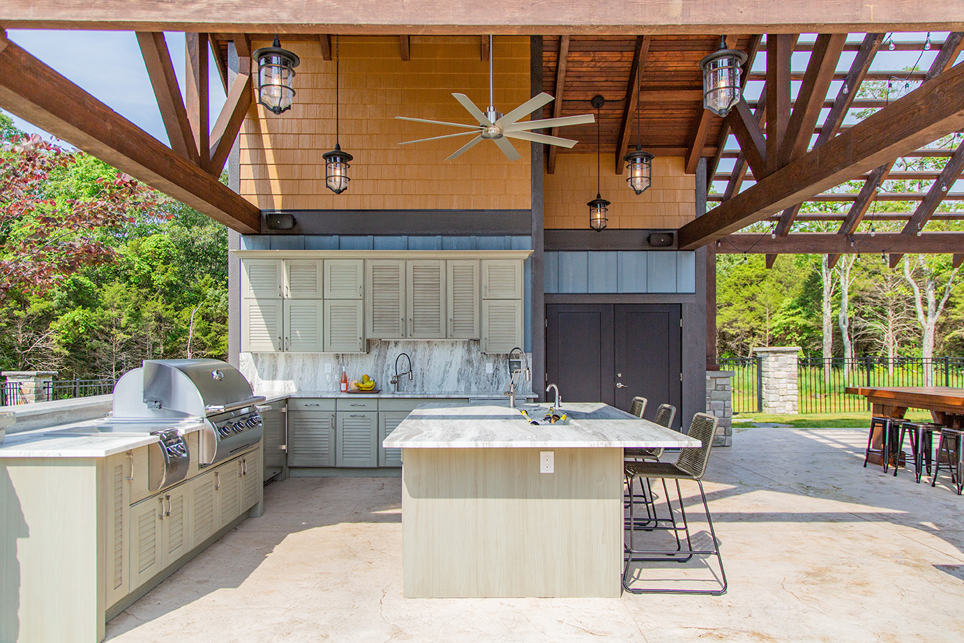 The nearby kitchen rivals many primary kitchens in its functionality, doing so in keeping with the home’s Arts and Crafts-inspired aesthetic. Working with Mike Beck, they selected louvered door styles in Silver Birch from NatureKast, a line of outdoor kitchen cabinets renown for a revolutionary technology ensuring 100% weatherproof cabinetry.