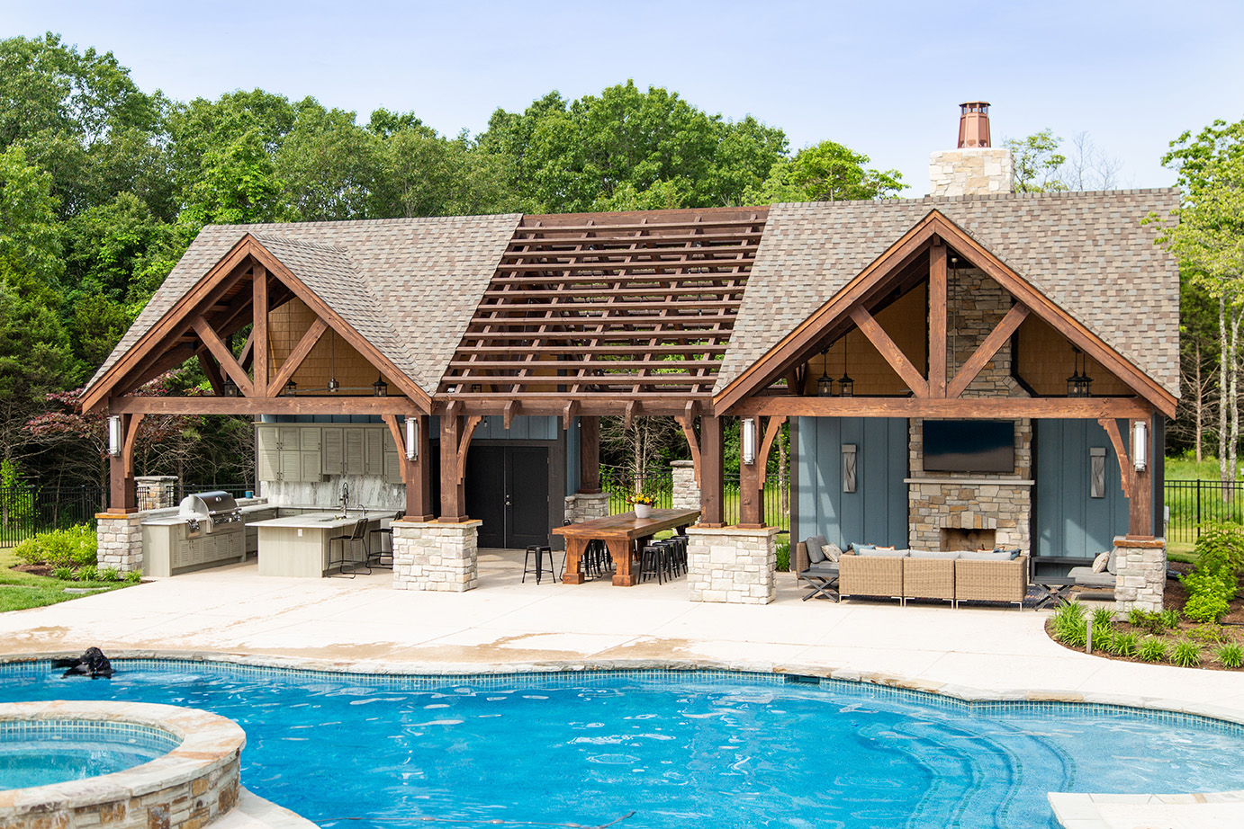 In the nearby town of Hillsboro, one family’s new home incorporates outdoor kitchen cabinets in a pool house design that pays homage to time spent at Big Cedar Lodge and travels to Keystone, Colorado.