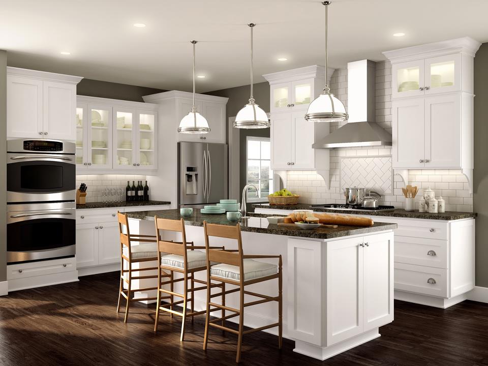 The Current line of cabinetry by Crystal offers a wide variety of door styles, wood species and stain selections, but at a lower price point and with shorter lead times. The kitchen above features the Meadowland door finished in Simply White. Custom details include stacked cabinets with framed glass doors, brackets and stacked crown.