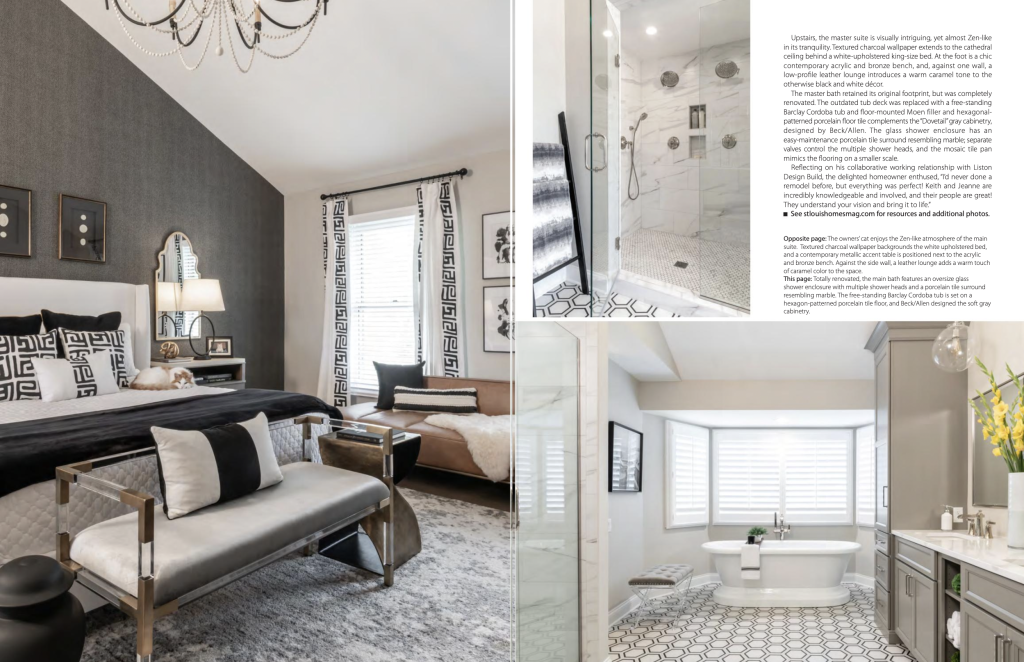 Guiding principles of the renovation led by Keith and Jeanne Liston included the homeowners’ chosen high-contrast palette consisting of black, white and gray. The project was a next step for this St. Louis couple looking to downsize and took the opportunity to bring their personal list of long-awaited design concepts to fruition.